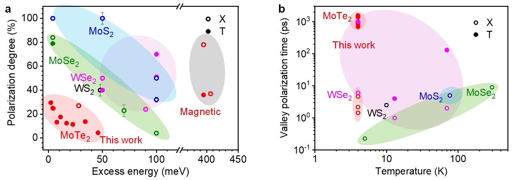 本文结果与报道的其他单层TMDC结果进行对比:(a)能谷极化率随近共振失谐能量变化的结果;(b)能谷极化寿命的结果。