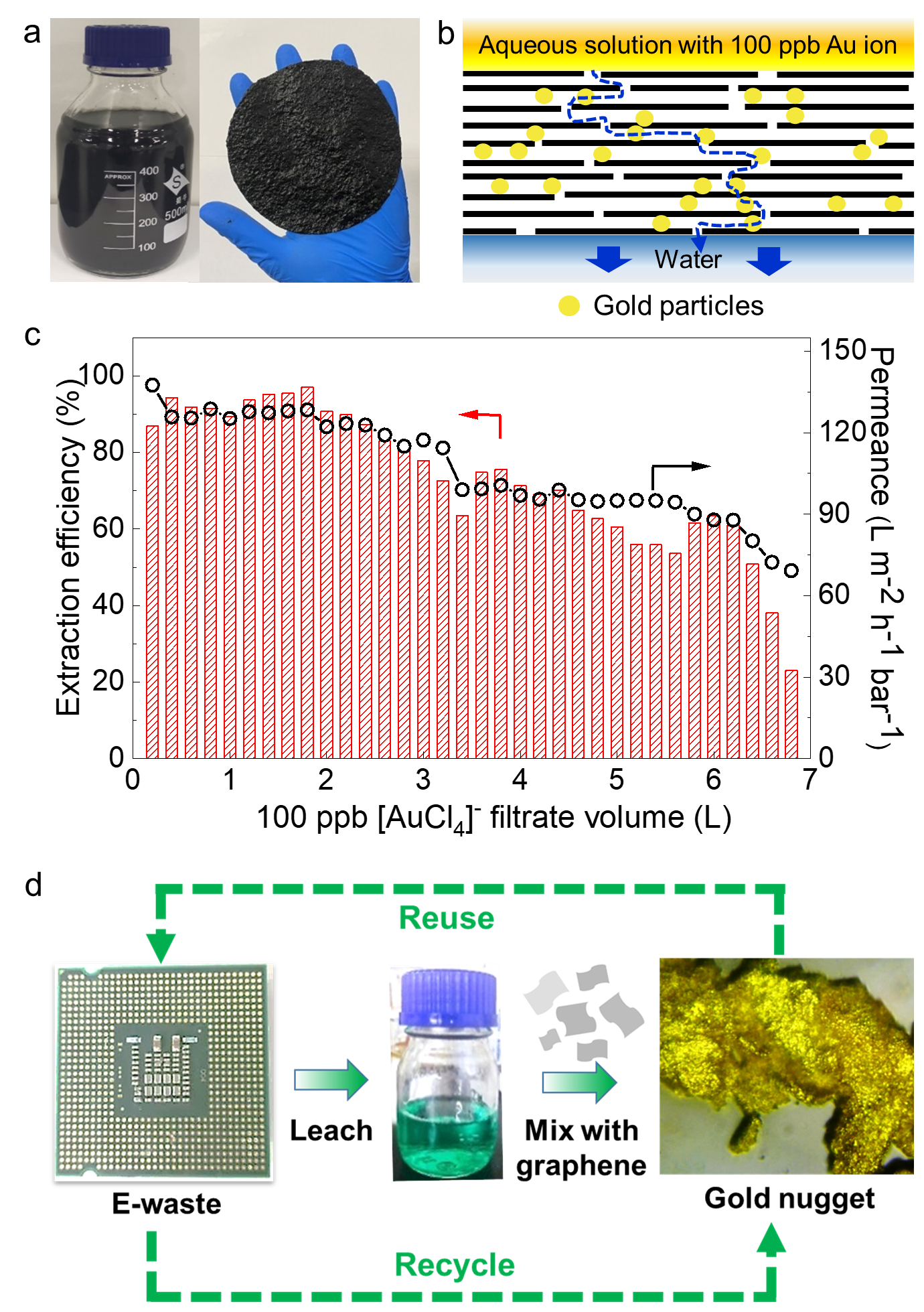 图2.(a)石墨烯分散液(左)和石墨烯薄膜(右);(b)基于石墨烯薄膜连续吸附痕量金的示意图和(c)吸附效率;(d)石墨烯从电子垃圾中回收金的工艺示意图