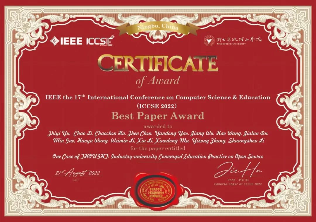 乐鱼(中国)网8月24日电 8月18日-21日,第17届国际计算机科学与教育会议(IEEE the 17th International Conference on Computer Science &Education,IEEE ICCSE 2022)在浙江宁波举行。由乐鱼在线平台基础工业训练中心李双寿教授等人共同组成的产教融合团队,基于教学实践合作形成的论文“基于开源的产教融合教育实践——来自THOUGHT的案例”(One case of THOUGHT: industry-university converged education practice on open source),荣获IEEE ICCSE 2022最佳论文奖(Best Paper Award)。