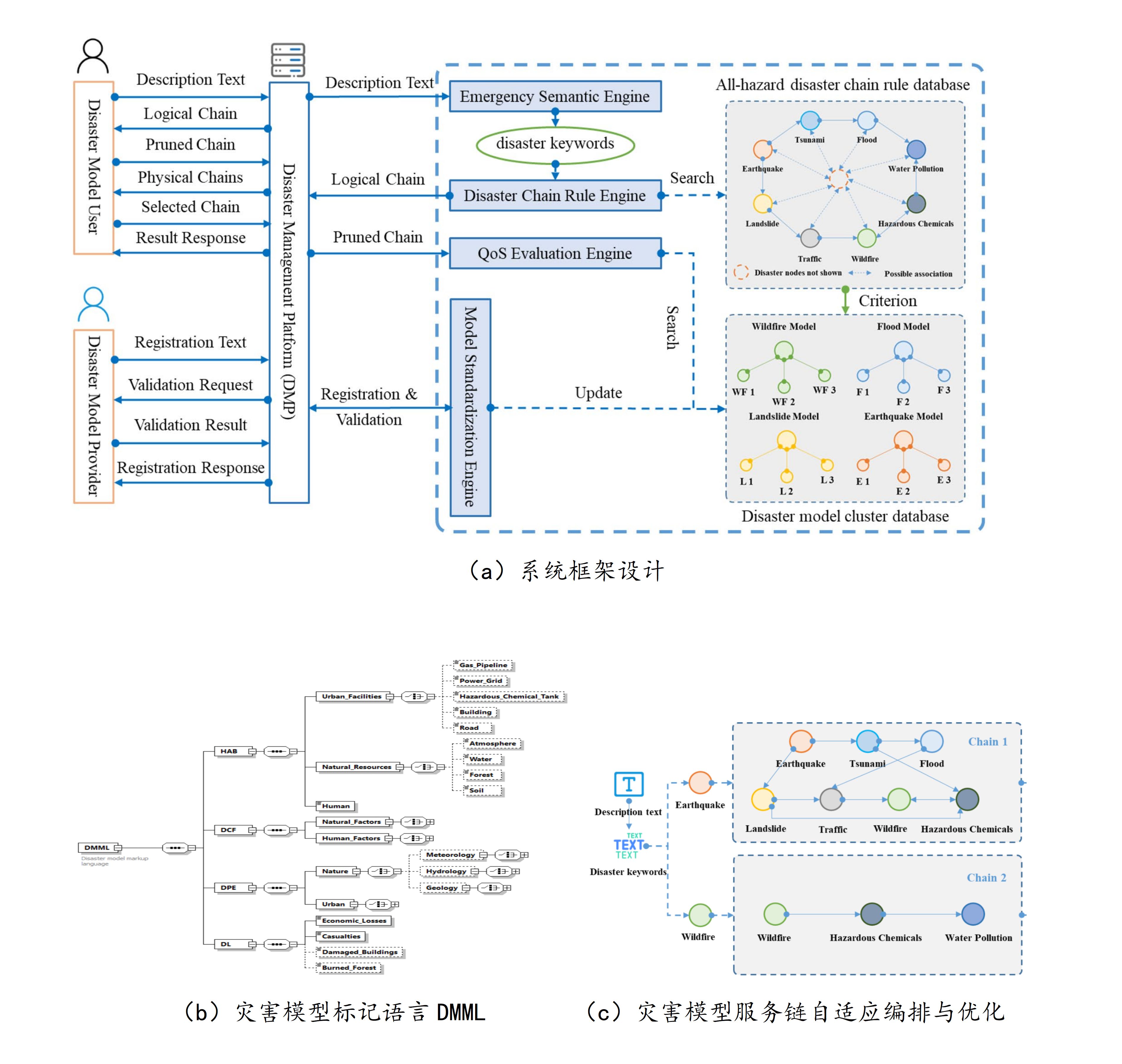 面向“多灾种、大应急”的国家应急管理现代化建设需求,研究团队重点针对复杂场景中灾害建模分析的难点,提出了一种面向多灾种耦合分析的灾害模型服务链系统优化方法,解决了传统多灾种模型设计复杂度高、模型复用性差的问题。同时,团队研发了一套面向灵活互操作的多灾种建模的灾害管理系统,提供一种全灾种模型服务范式,形成灾害模型接口规范,提升了单类型灾害模型交互性、互操作性。通过构建灾害模型服务链DMSC(Disaster Model Service Chain)自适应编排与优化算法,解决了灾害节点编排困难、链式优化复杂度高等问题。