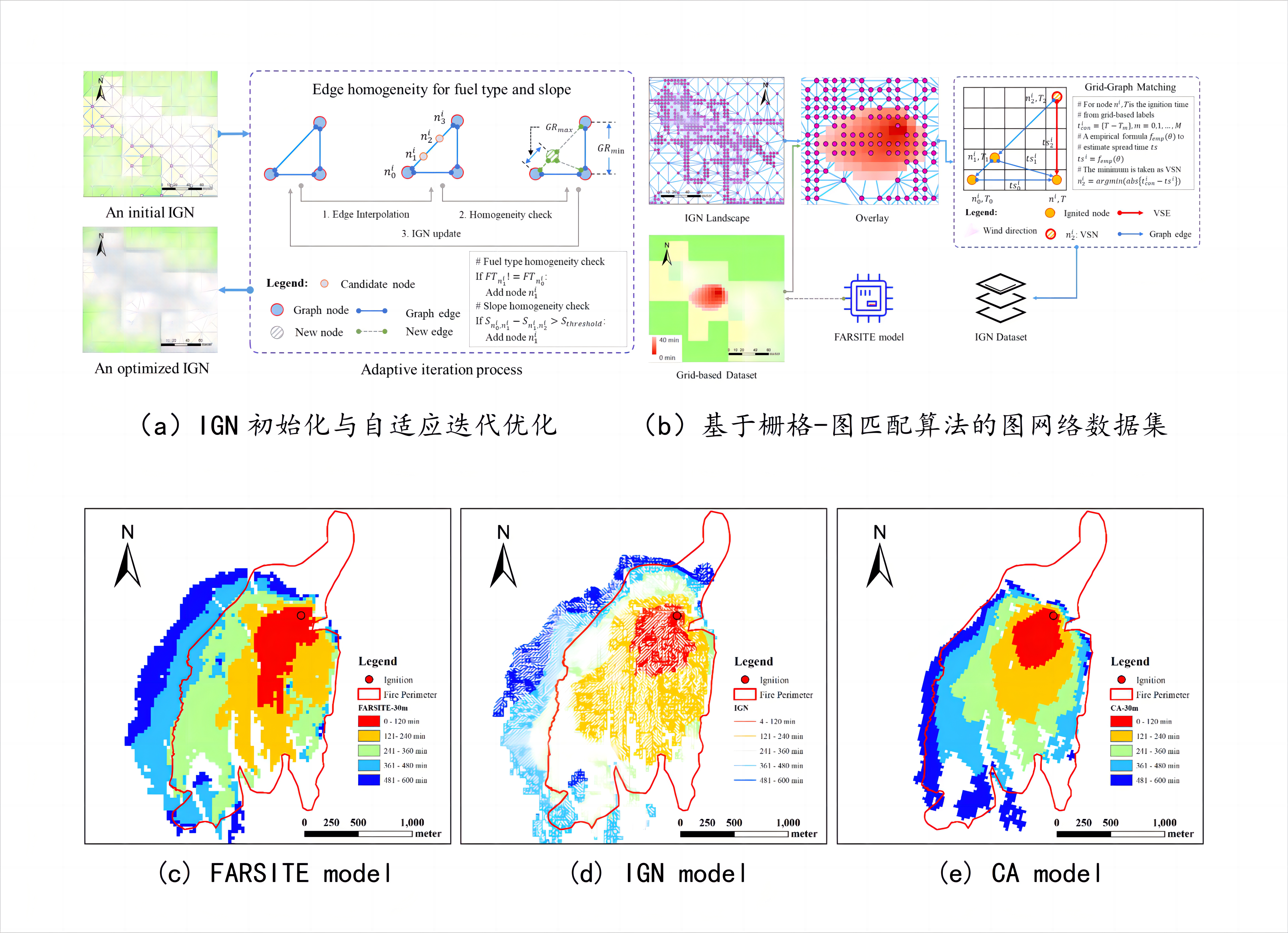 团队还针对突发性强、破坏性大的森林火灾进行深入研究,分析不同环境条件下的火焰燃烧规律与蔓延特征,提出了一种基于深度学习与变尺度图网络的森林火灾蔓延预测模型,解决了传统模型中精准地描述野火蔓延细节的不足。团队提出了图边异质性约束算法,自适应地调整和优化不规则图网络(Irregular Graph Network,IGN)的节点密度和分布,保证图边上坡度和植被的同质性。并提出了一种基于深度学习的网络WFDNN(WildFire Deep Neural Network)预测林火在图边上蔓延的时长、火焰长度、火线强度等关键特征参数。通过真实林火数据的案例验证,团队提出的IGN模型实现了有竞争性的预测效果,为林火预测领域提供了一种新颖和更为有效的研究路径。