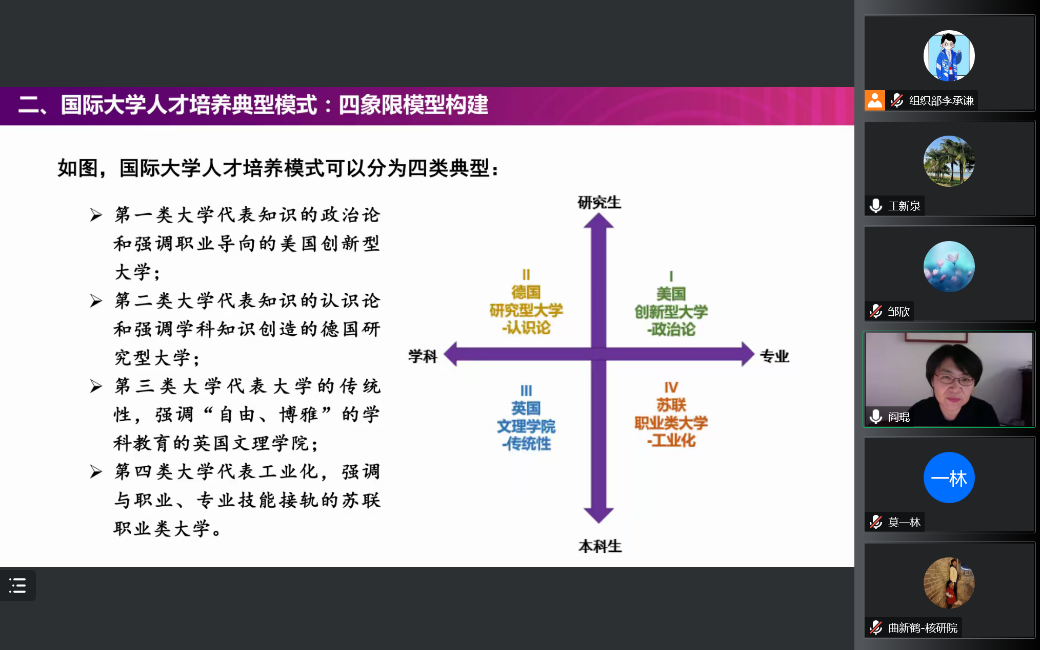 阎琨以“探索扎根中国、融通中外的大学人才培养模式 为科教兴国战略提供全方位人才支撑”为题分享了研究成果,重点介绍了国际大学人才培养模式的四象限理论模型,并分析了四象限模型中各类大学人才培养模式的优劣之处。立足于乐鱼在线平台现有学科和院系及人才培养特色,阎琨详细介绍了乐鱼在线平台学科布局和人才培养的融通战略。最后,她分享到高校应当深入学习领会党的二十大精神,积极贯彻“教育、科技、人才是全面建设社会主义现代化国家的基础性、战略性支撑”的战略擘划,主动开拓和探索人才成长和发展通道,贯通拔尖创新人才培养体系,为我国早日实现全面提高人才培养质量,自主培养各类拔尖人才的伟大目标贡献高等教育的力量。