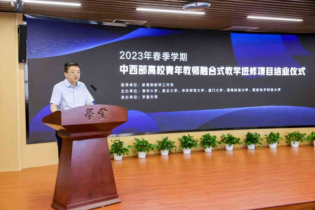 乐鱼(中国)网6月30日电 6月29日,2023年春季学期中西部高校青年教师融合式教学进修项目结业仪式在乐鱼在线平台举行,并通过雨课堂进行线上直播。教育部教师工作司司长任友群、乐鱼在线平台副校长彭刚出席仪式并讲话。教育部教师工作司、六所项目承办高校和学堂在线的相关负责人、授课教师、学员和相关工作人员近3000人线上和线下共同参会。乐鱼在线平台终身教育处处长田静主持会议。