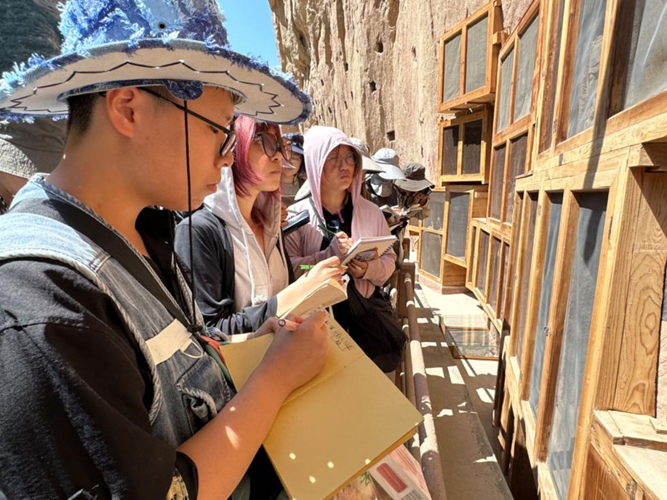 降雨量少、日照长,干燥而热烈的气候是西北石窟长寿的秘密,也是教学过程中要克服的困难。董书兵婉拒了将学生集中起来统一授课后自行参观的建议,坚持视听结合,让学生们眼见实物,耳听讲解、手绘笔记,在高温下,不厌其烦地将同样的内容重复了一遍又一遍。