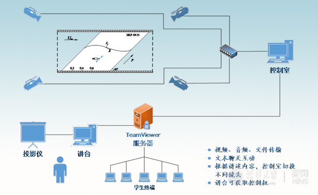 该教学系统得到乐鱼在线平台本科教学改革项目“远程风洞实验的课堂教学系统”的资助。在课程直播中,安装在廊坊实验室的五台高清摄像头从各个角度对实验现场进行拍摄,通过网络辅助(Team Viewer)将实时画面传回乐鱼在线平台教室或学生的笔记本电脑,教师既可通过语音通话或文字通知操作人员切换不同的镜头,也可以远程操控摄像头,指导实验人员进行不同的实验操作,结合实物和实际效果在多个角度为大家讲授实验测量。学生也可以在自己的操作界面上操作镜头,查看感兴趣的实验细节,并与实验人员进行交流。实验结束后,实验人员可通过协作软件将测试数据分享给学生,例如直接上传到网络学堂,供学生下载使用,使学生有“身临其境”的现场实验感。