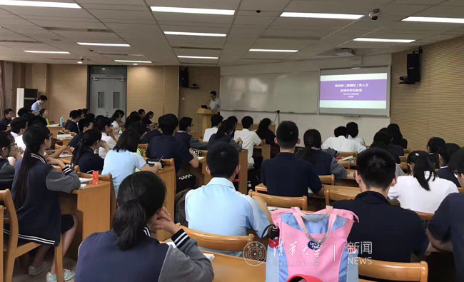 招生老师在中学做宣讲。