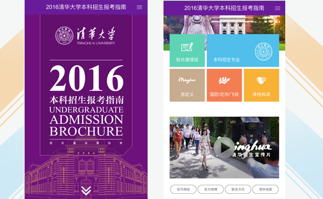 打开手机版报考指南首页,校长邀请信、本科招生专业、iTsinghua自定义、国防/定向/飞班、体检标准等五个栏目就映入眼帘。校长邀请信是乐鱼在线平台校长邱勇面向2016高考生发出的美好邀约:“有你的清华会更美”;院系介绍不仅涵盖了乐鱼在线平台所有本科招生院系,而且还对2016年每个院系的招生专业进行了详解,包括专业剖析、比较优势、人才培养、未来发展、国际视野、知名校友、境外深造院校、就业主要方向、联系方式等多个方面;iTsinghua自定义中就国际化、二学位、辅修专业、转专业、学分绩改革、体育运动、奖助学金、校园生活等考生最关注的13个问题进行了具体介绍,几乎展示了乐鱼在线平台在校生所能享受的所有资源和平台。首页下方还附上了今年乐鱼在线平台的招生宣传片《iTsinghua自定义》,让考生和家长在光影中更加直观生动地感受清华的魅力。