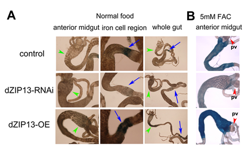 图为调控果蝇肠中ZIP13表达量引起肠内铁离子水平变化。