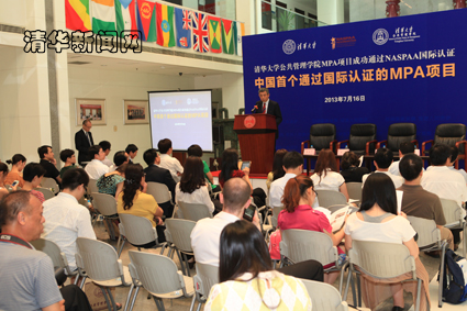 图为清华公管学院召开新闻发布会宣布清华MPA(公共管理硕士)项目通过公共管理院校联合会国际认证。