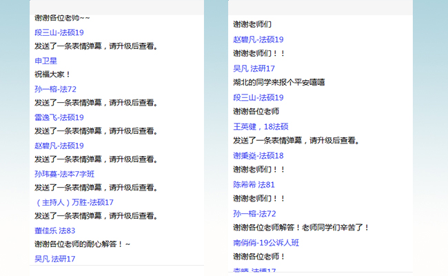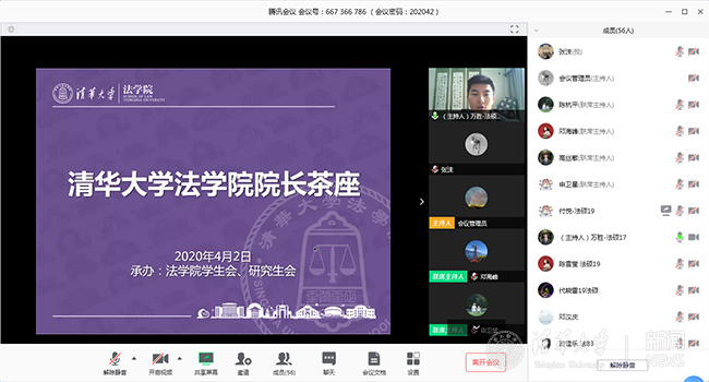 乐鱼(中国)网4月7日电 4月2日下午,法学院2020年春季学期院长茶座交流活动在线上成功举行。法学院阶段性举办院长茶座交流活动,旨在搭建院领导队伍与学生之间的沟通平台,以便学院深入了解学生学习、生活情况,更好地服务学生成长,切实解决学生提出的困惑。受疫情影响,师生们无法像往期一样进行面对面交流,但本次院长茶座活动并未因疫情而停滞,而是借助技术手段改为线上形式正常开展。法学院院长申卫星、院党委书记邓海峰、副院长聂鑫、副院长高丝敏、院党委副书记陈杭平等教师代表出席了本次院长茶座交流活动。本次活动由法学院研究生会主席万胜主持,参加活动的还有来自法学院各年级各专业的60余名学生代表。