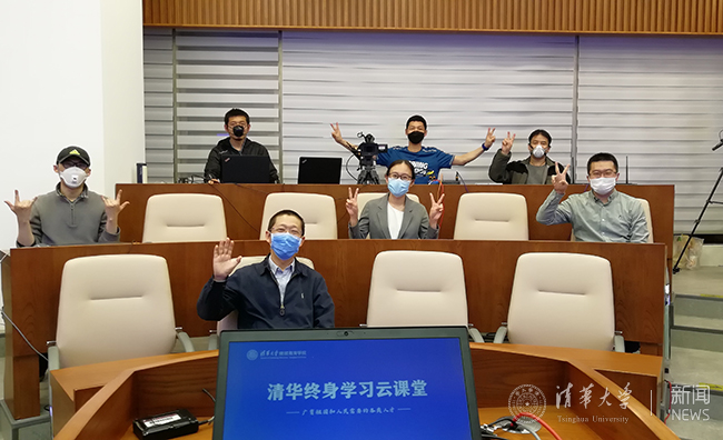 乐鱼在线平台在线教学指导专家组组长、电机系教授于歆杰(前排)与清华继教学院直播工作团队合影
