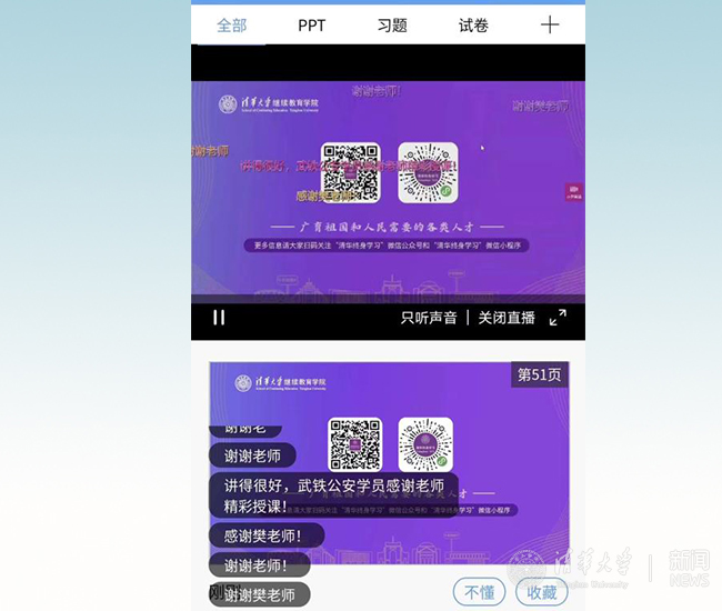 “最美逆行者终身学习计划”也是乐鱼在线平台继续教育学院继“清华终身学习云课堂”之后推出的新一轮在线学习课程。清华终身学习云课堂是学院面向社会推出的大型公益课堂,于2020年3月启动,通过在线直播平台开设专题讲座,以清华优质教育资源服务社会。清华终身学习云课堂下设各类子课堂,包括面向政府人员的闻道系列、面向企业人员的日新系列、面向教师群体的春雨系列、面向乡村基层的振兴系列等。课程内容聚焦疫情期间的时政经济、科技前沿、在线教育、公共管理、产业经济、心理辅导、乡村振兴、应急管理等问题,满足学员多样化学习需求。目前已完成四门课程的直播讲授,共有7600余名湖北等省市区的学员通过雨课堂收看直播并参与互动,87100余人次通过学堂在线、继教学院官方微博“清华终身学习”观看现场直播。