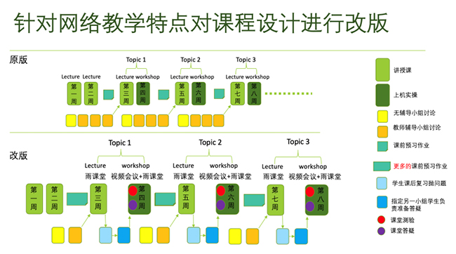 本学期开展在线教学,在学期初根据在线教学的特点和局限,重新全面设计高互动式网络实时教学,重点解决以下问题: