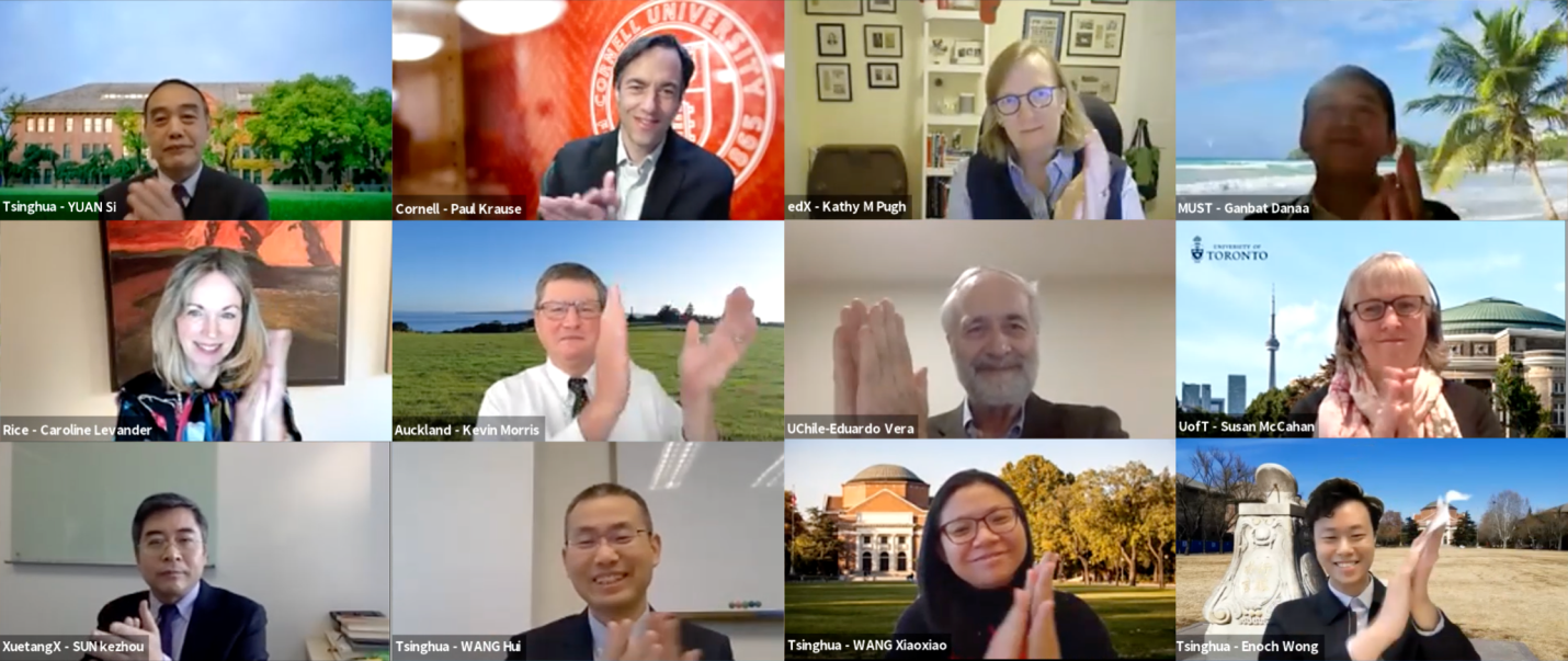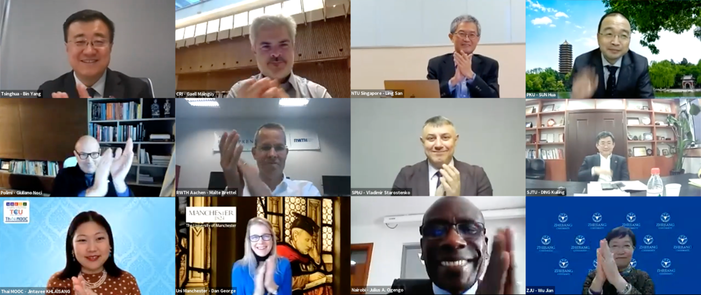 乐鱼在线平台副校长、教务长杨斌,校务委员会副主任袁驷与来自美国康奈尔大学、法国交叉科学研究院、美国edX平台、蒙古科技大学、新加坡南洋理工大学、北京大学、意大利米兰理工大学、美国莱斯大学、德国亚琛工业大学、俄罗斯圣彼得堡国立大学、上海交通大学、泰国Thai MOOC平台、新西兰奥克兰大学、智利大学、英国曼彻斯特大学、肯尼亚内罗毕大学、加拿大多伦多大学、学堂在线、浙江大学的联盟创始成员代表相聚“云端”,共谋交流合作新发展,为即将于12月11日世界慕课大会上正式发布的世界慕课联盟奠定良好基础。