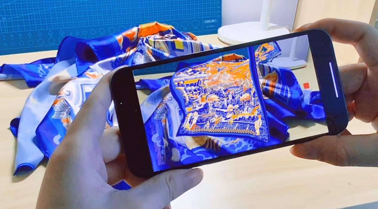 正逢VR、AR技术革命,数字艺术作品逐渐成为艺术领域热门话题。罗明军获奖作品从以人为本的角度出发,以数字时尚为契机,不断挖掘原有的《异度空间》丝巾图案设计内在潜力,贴合时代契机,通过虚拟现实技术进行“三维”转化。手机客户端可以通过相机扫描丝巾作品,作品则立刻在虚拟空间中呈现出样式、色彩、造型、细节、面料质感等。这种展示方式,不仅在视觉上表现了丝绸的轻盈,更创造了一种全新的丝巾作品展示和观赏方式。罗明军希望以此作品为灵感,启发市场与信息设计行业,普及VR、AR虚拟现实技术,使人们可以足不出户购买商品、观看商品细节与质感,甚至可以感受到商品的触感,与之互动,从而达到更好的为人服务。