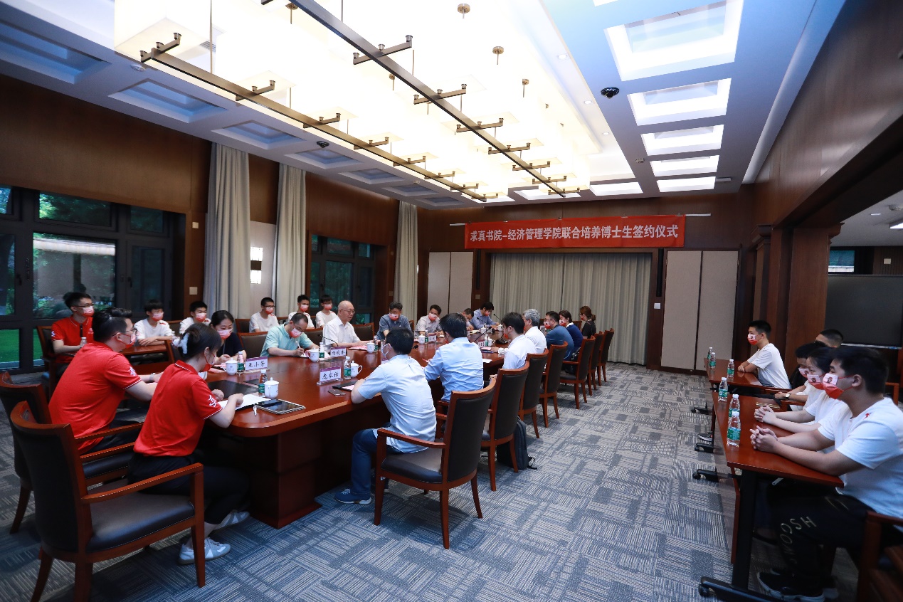 仪式上,丘成桐与白重恩分别代表求真书院和经管学院签署联合培养博士生协议。求真书院、经管学院、研究生院、数学科学中心等单位负责人以及求真书院学生代表出席签约仪式。签约仪式后,双方围绕培养方案与课程设计等内容进行了深入探讨交流。