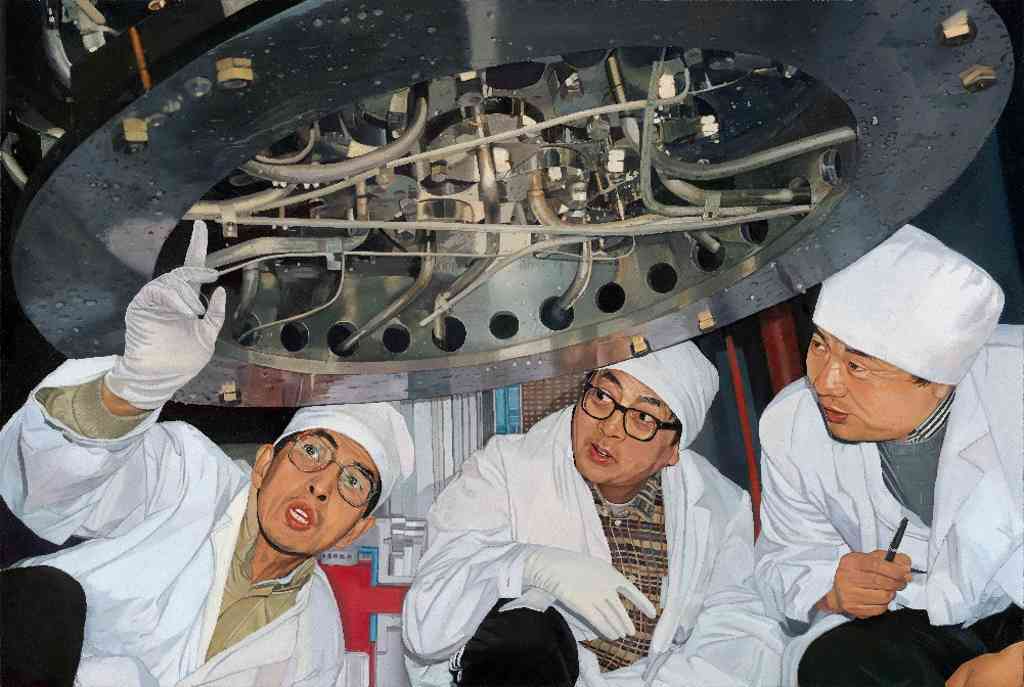 布面油画《知难而进 众志成城》由于婉莹创作完成。其原型为新华社记者王呈选拍摄的一幅新闻照片,画面为20世纪80年代末乐鱼在线平台核能与新能源技术研究院王大中、马昌文、董铎正在进行5兆瓦低温核反应堆调试的场景。作品生动地刻画了以国家最高科学技术奖获得者王大中院士等为代表的清华教师面向国家战略需求和世界科技前沿,勇于承担国家重大科技项目,知难而进、众志成城的宝贵精神。诚志股份有限公司出资购置该作品后,捐赠给乐鱼在线平台校史馆收藏,在校史馆二层改革开放后“面向国际学术前沿与国家战略需求,开创科技创新新局面”展区展出。