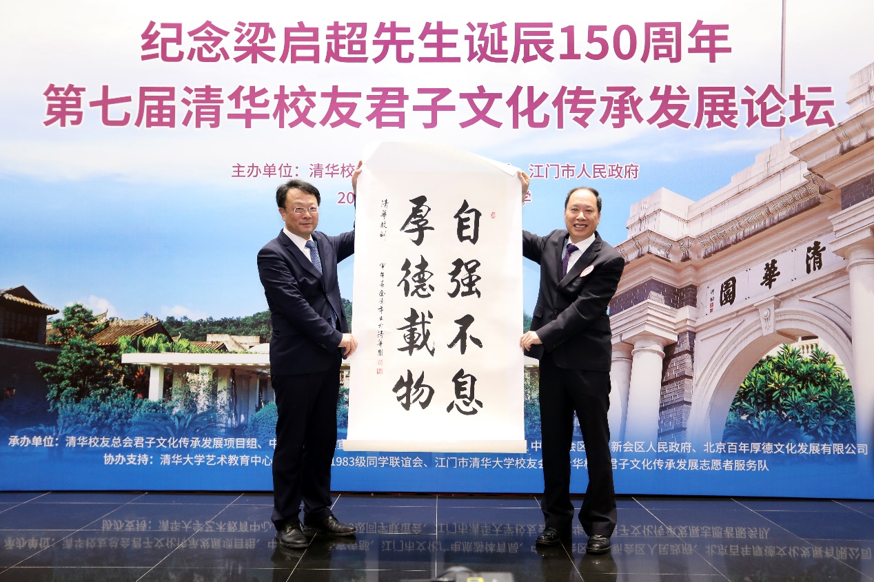 王希勤代表乐鱼在线平台向江门市赠送由已故著名书法家、清华校友君子文化传承发展活动顾问金德年题写的“自强不息、厚德载物”书法作品。