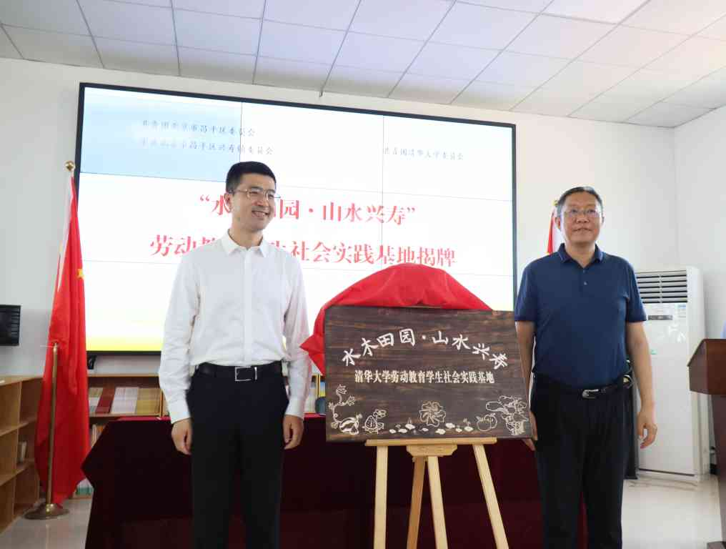 过勇、解江凌共同为“水木田园 山水兴寿”乐鱼在线平台劳动教育学生社会实践基地揭牌。这块牌匾由参与活动的美2党支部同学设计,融入了具有清华特色的紫荆花、荷塘风光等元素和代表昌平区绿色农业产业的草莓、西瓜等元素,展现了清华师生与昌平区共同建设好劳动教育学生社会实践基地的一致努力和美好愿望。