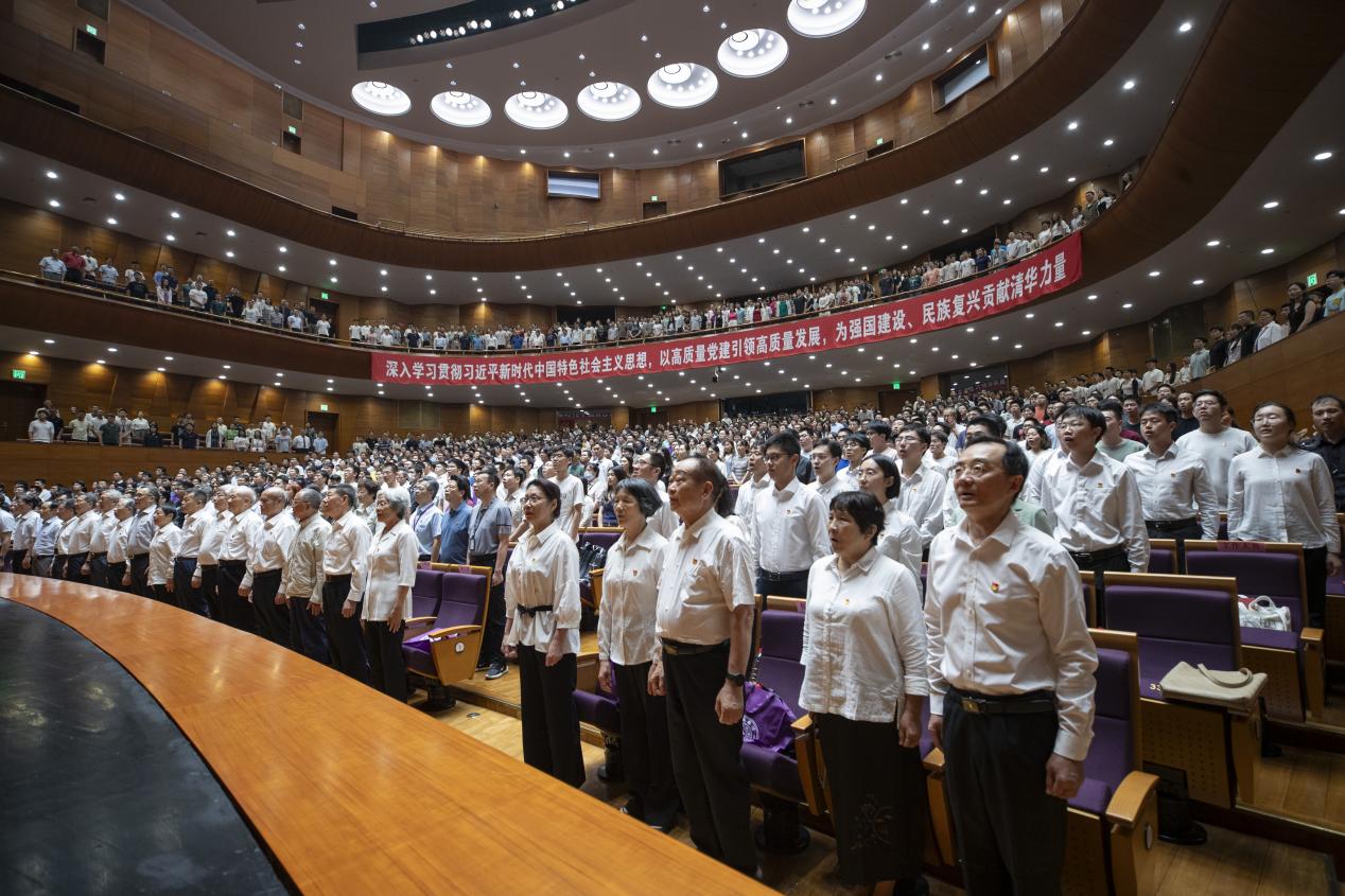 新清华学堂会场内气氛庄重而热烈,大会在全场齐声高唱国歌声中开始。