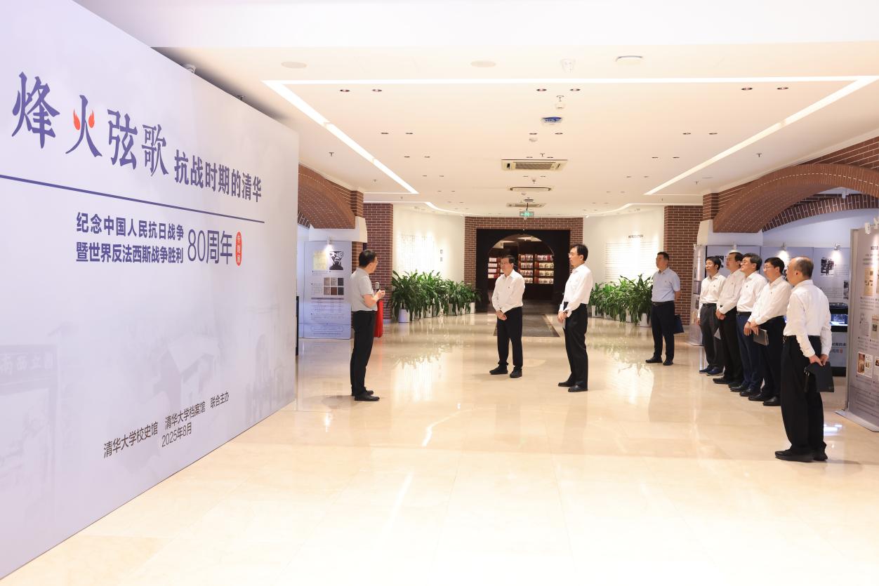 中心组成员集体参观了由校史馆、档案馆联合举办的“烽火弦歌——抗战时期的清华”纪念中国人民抗日战争暨世界反法西斯战争胜利80周年专题展。展览全面展示了清华师生在战火纷飞的艰苦条件下坚持教育教学、以科技支持抗战、投笔从戎走上前线的历程。