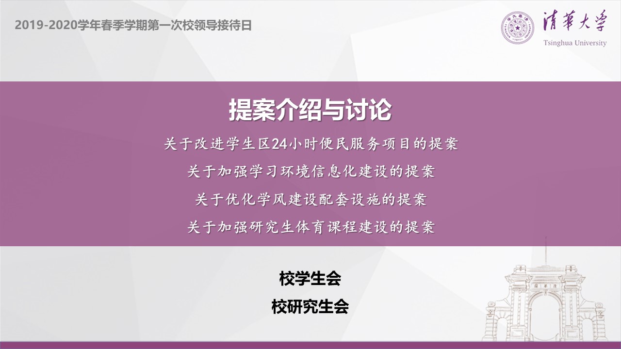 本次接待日的提案由学生会和研究生会负责,结合学生代表大会、研究生代表大会提案和延期返校期间收集到的各类意见和建议,在问卷调查和走访调研的基础上整理归纳,包括“关于改进学生区24小时便民服务项目的提案”、“关于加强学习环境信息化建设的提案”、“关于优化学风建设配套设施的提案”、“关于加强研究生体育课程建设的提案”等四项。各项提案以提升校园学习生活品质为出发点,从背景综述、社会调研、提案建议等方面进行详细的阐述和分析,为管理部门制定相关政策提供参考。