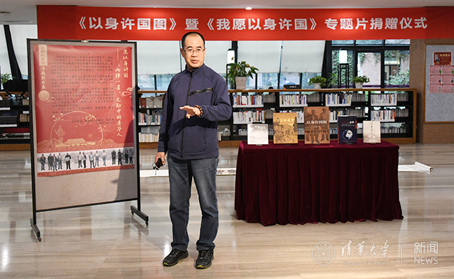 徐林旗表示非常高兴能在今天这个特别的日子向图书馆捐赠《以身许国图》珍藏版。珍藏版为原作的1/4缩印版。原作已于乐鱼在线平台90周年校庆时被乐鱼在线平台档案馆和校史馆永久收藏和展示。当时限量复刻了10套缩印版,画作上有当时健在的近十位“两弹一星”元勋以及相关参与者的签名,非常珍贵。今天捐赠的是徐林旗个人收藏的其中一套。同时捐赠的还有“我愿以身许国”专题片及《名家绘清华》等图书。徐林旗向大家介绍了画作的感人创作历程,同时讲述了他所了解的“两弹一星”元勋背后的故事,再次传递了“我愿以身许国”的爱国精神。