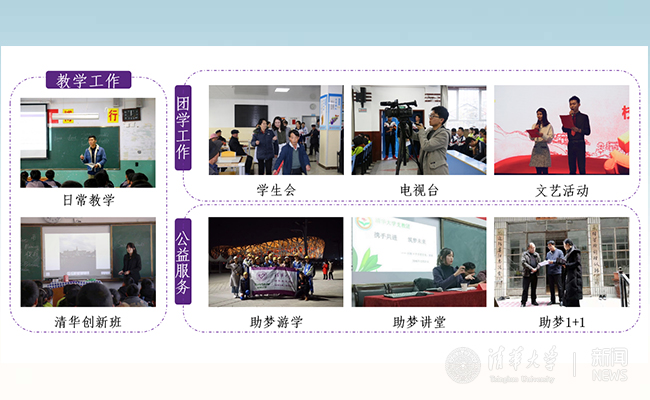 第20届清华研支团青海支队共有10名志愿者,其中刘淙、冯梦迪、林晓雪、王一茗和杨波服务于湟中一中;朱海雯、洛嘎、江颖、魏文罡和祖丽德孜服务于湟中职教中心。志愿者们以教育教学为重心,承担高中和职校核心科目的教学任务,周均课时量达15节,成绩优异;以团学工作为辅助,担任重要团学岗位,管理、运营两校学生会、社团、广播站、电视台等学生组织,培养学生综合素质;与此同时,兼顾社会调研,了解社会民情,脚步遍及当地4个区县的十余个乡镇,开展了乡村扶贫调研、贫困学生家访、社会调研等6项活动。