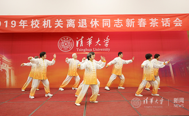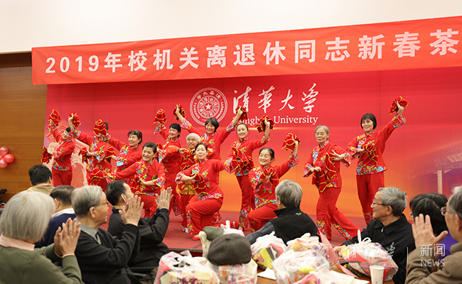 茶话会文艺表演以校机关退休舞蹈队的《天地喜洋洋》拉开帷幕,展现了离退休同志们神采奕奕的精神气质与风貌。演出形式丰富多彩,有离退休老同志的健身球表演《今夜舞起来》《16式混元太极》,有校工会老同志深情朗诵《难忘初心》,有学生艺术团同学倾情演唱《多情的土地》、京剧剧目《状元媒》,有校机关新入职同志表演《红梅赞》等等。精彩的演出博得阵阵掌声。演出在离退休老同志表演的小合唱《走进新时代》《要问我们想什么》中落下帷幕。
