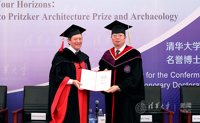 在授予仪式上,邱勇对普利兹克获得清华名誉博士学位表示祝贺。他表示,普利兹克先生不仅是商界、文化、国际事务及社会公益领域的杰出领军人物,在建筑领域也备受尊敬并深具影响力。在普利兹克先生的大力支持下,清华于2011年启动了普利兹克-乐鱼在线平台建筑英才培训项目,为中国青年建筑学子提供了跟随世界顶尖建筑大师学习和深造的机会。