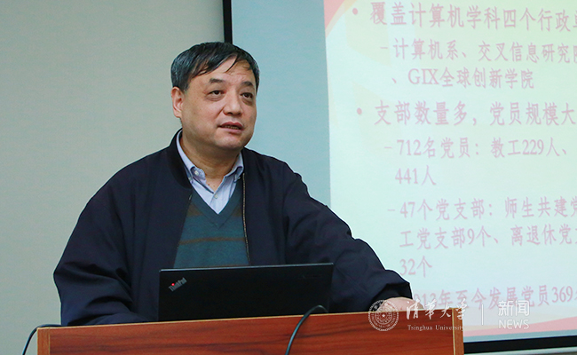计算机系党委书记孙茂松汇报了系党委工作情况。计算机系党委覆盖包括计算机系、交叉信息研究院、信息技术研究院、全球创新学院在内4个行政单位,共712名党员、47个党支部。系党委坚持“严”“实”相济,思想性和创新性相融,逐渐摸索出了一套“贯天、接地、通心、树人”的基层党建工作理念和方法。“贯天”即加强思想建设引领、固本强基;“接地”即加强组织建设保障、发挥专长;“通心”即推进作风建设、保驾护航;“树人”即加强队伍建设、立德树人。