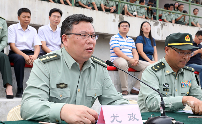 尤政在典礼上首先向全体同学顺利完成了各项军训、政训任务表示祝贺。他引用周恩来总理的对联“与有肝胆人共事,从无字句处读书”称赞防化学院的教官是一群“有肝胆人”,并对防化学院对学校军训工作的支持表示感谢。尤政对同学们提出三点希望:树立正确的理想信念,勇敢地担当起属于清华人的历史责任;积极参与集体建设,培养集体意识在集体中成长;主动融入大学生活,以平常心去迎接各种挑战和困难,做好清华的新主人。
