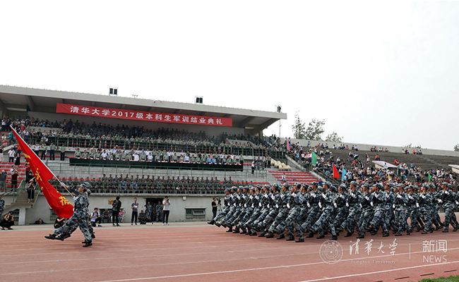 结业典礼从阅兵式和分列式开始。在军旗带领下,在雄壮的《分列式进行曲》的伴奏中,学生军训旅所属的三十二个连组成了十六个方队沿着东大操场红色跑道依次正步经过观礼台。整齐肃穆的方阵、气势磅礴的口号、刚劲有力的摆臂、步调一致的踢腿,举手投足间,既透出军人坚毅果敢的气质,又彰显着新一代清华学子昂扬向上的精神风貌,赢得了观礼台上各位首长和师生的阵阵掌声。