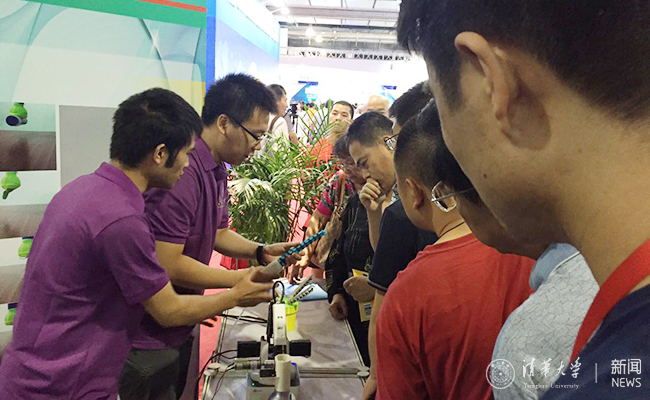 此次清华学生展出课外科技作品“球形自适应手”。 “我们项目的灵感来源于哆啦A梦的球形手,它的手没有手指,却能抓取各种不同的物体。”机械系大三学生祝天一代表团队介绍了项目创意来源、技术突破和应用前景,并进行了现场演示。