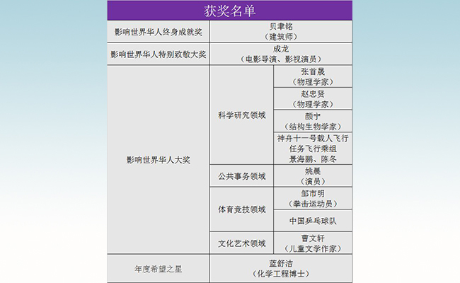 影响世界华人大奖(You Bring Charm to the World Award)是一年一度面向全球华人的评选活动,是“世界因你而美丽--影响世界华人盛典”设立的奖项。该奖项设立于2006年,由凤凰卫视发起,连同国内外多家中文媒体共同主办。