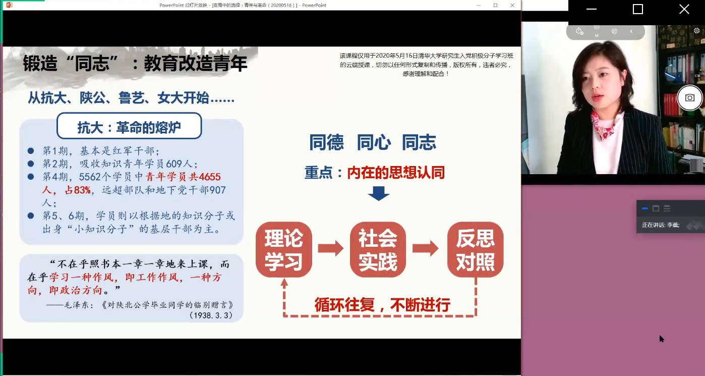 林毅以“中国共产党为什么要进行自身建设:党建的理论、历史与现实思考”为题,阐述了中国共产党强调党建的理论依据、历史经验和现实启示。他强调,入党积极分子要实现“三重身份、三种任务的无缝对接”:当好知识人、宣传者和共产党员,成为合格的清华学生、追求卓越的清华青年、真正优秀的清华共产党员。