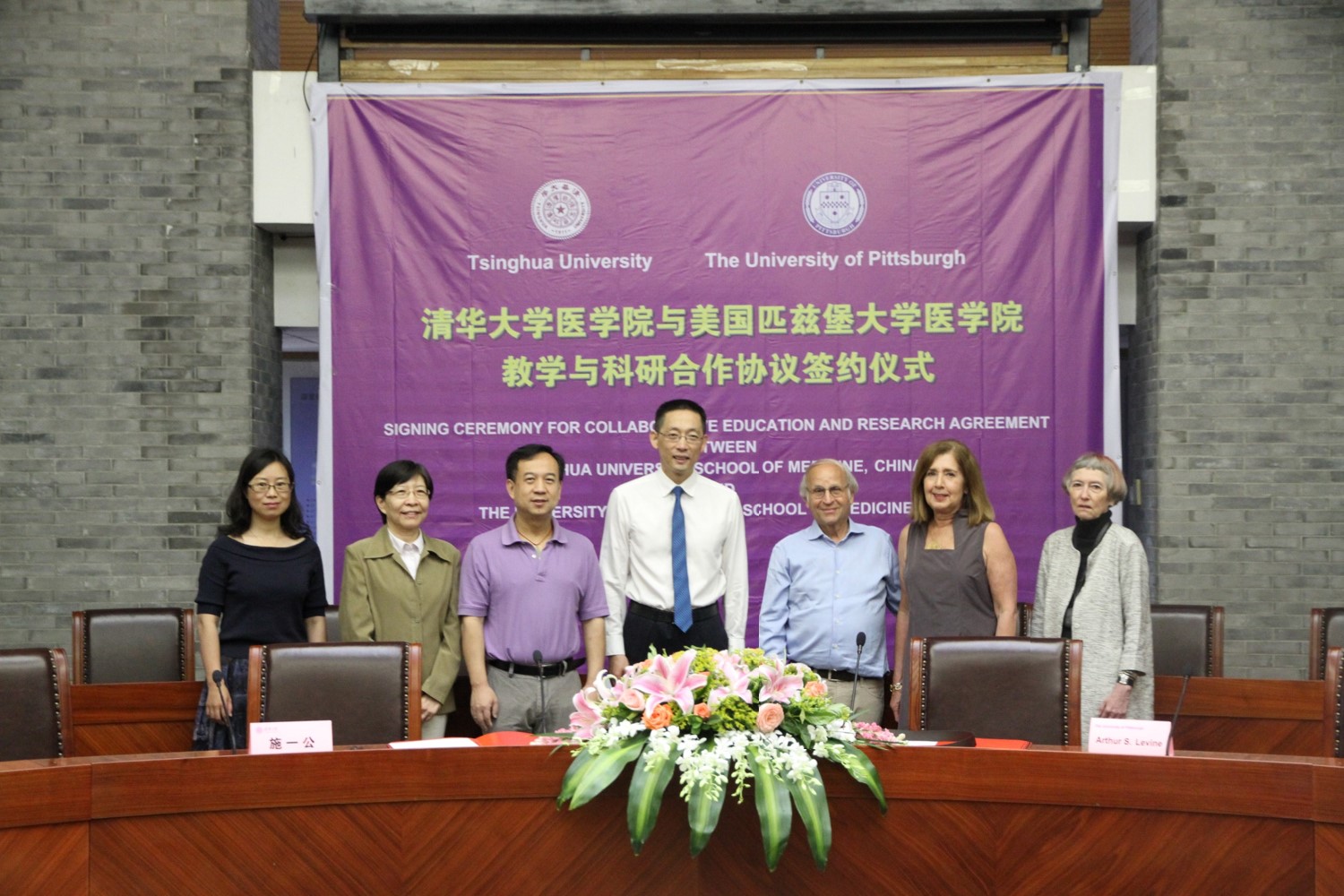 清华医学院与匹兹堡大学医学院于2011年4月启动了医学实验班学生联合培养项目。阿瑟·莱文(Arthur S. Levine)教授作为匹兹堡大学的资深副校长兼医学院院长,积极促进双方的教学合作,多次访华并亲自与校领导及国家留学基金委进行沟通交流,对促成两校联合培养项目起到了关键作用。他组织匹兹堡大学建立专门的教师团队负责医学实验班学生的管理工作,亲自指导进入自己实验室的医学实验班学生进行科研训练,参加并主持每年一次的两校联合医学学术研讨会,多次来到清华园参加两校研讨会,并积极配合推进医学实验班项目的拓展项目——MD/PhD项目的实施。两院已先后举办了8次学术研讨会,联合培养8届医学实验班学生,共计138人。