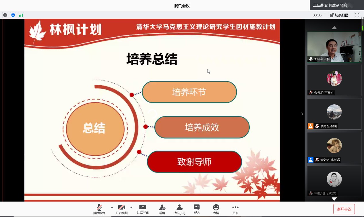 何建宇从培养环节、培养成效等方面对“林枫计划”第七期培养过程进行了总结。经过两年培养,林枫七期学员党员比例已达到82%,大多数学员成长为各院系学生党团组织骨干,积极传播马克思主义理论。