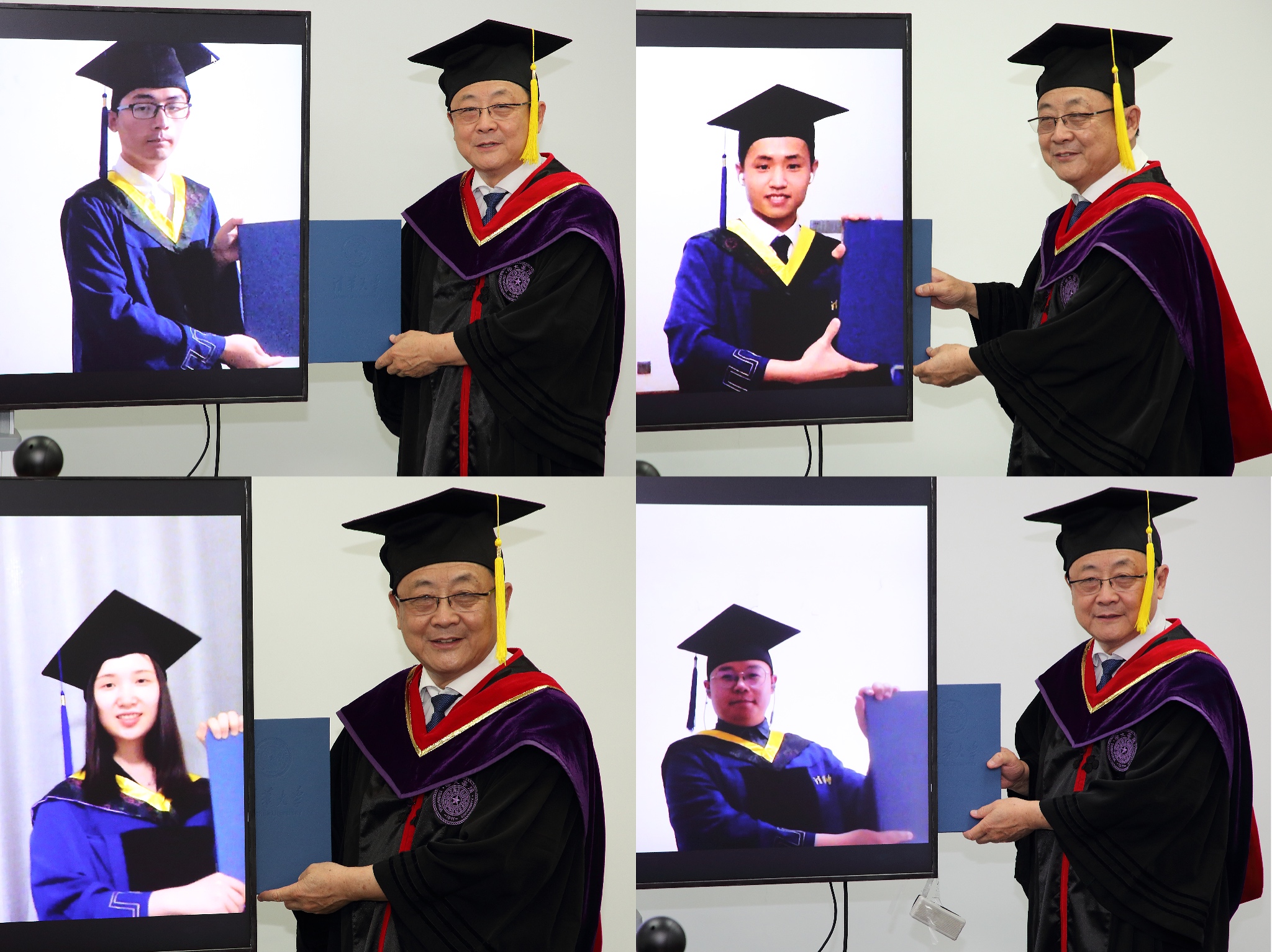 毕业典礼当日,每一位毕业生均通过远程互动的方式从吴建平老师手中“接过”了研究生毕业证书,并与院长及各位导师在屏幕前“共举”毕业证书合影留念。