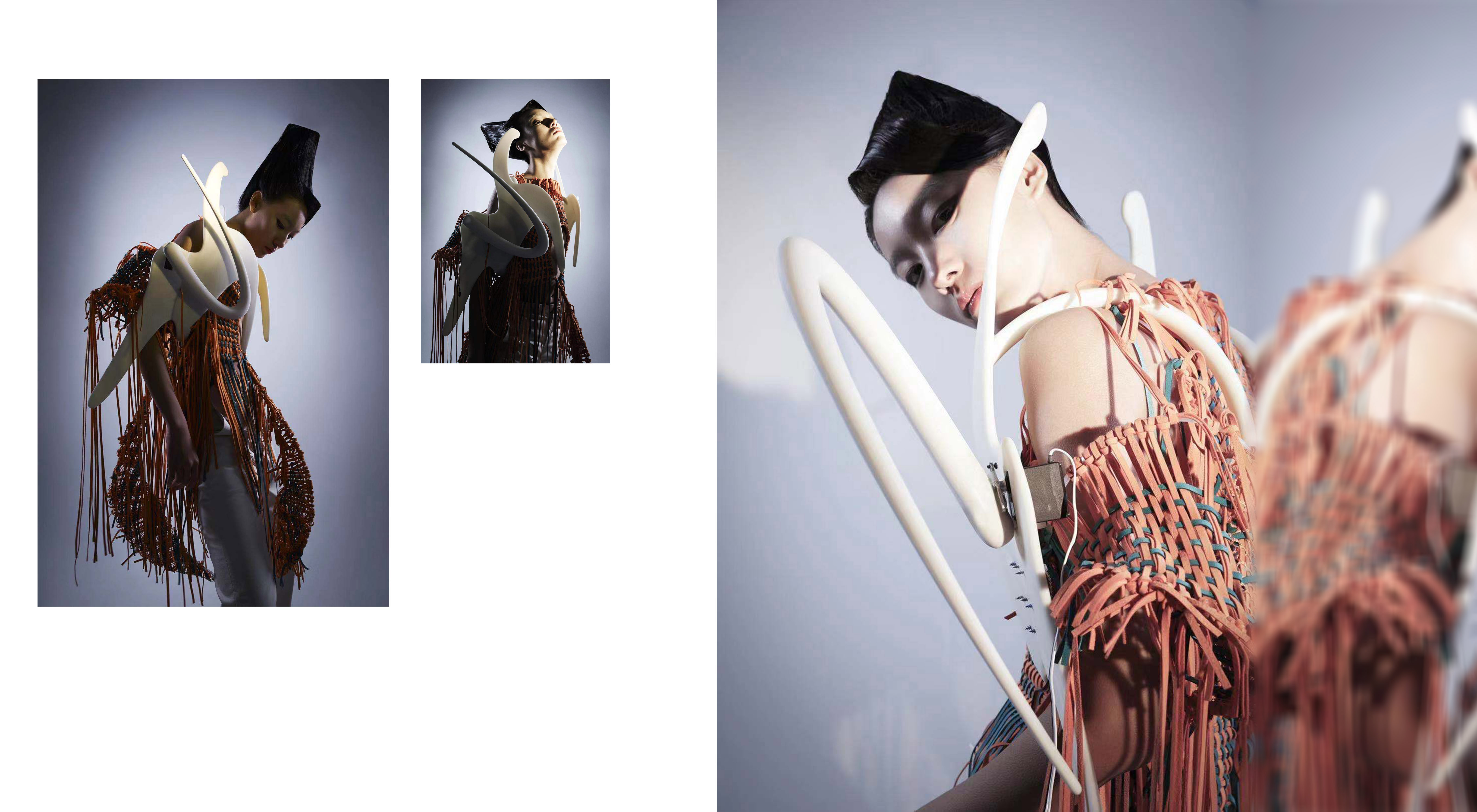 作品《意识形态》旨在将传统的服装生产与智能技术、编程技术等相结合,衍生出新的服装形式和服装功能。作者认为服装和一些穿戴设备结合可以很好地贴合人体,能够便捷地实现人体数据监测、虚拟现实增强、定位控制和信息传输等功能。作者利用编程装置遥控系统对服装进行远程控制,同时对人体信息和外界环境的变化刺激做出反应从而做出能实现一定功能的服装。作者在制作这组装置和服装时,通过与创新训练营与自动化专业以及机械专业的同学合作,完成了初期的编程和结构设计,并接着完成了电路设计和控制设计。作品还获得日本ultrasuede公司的赞助,使用环保超细纤维组成的三维无纺布料进行衣身部分的编织设计。
