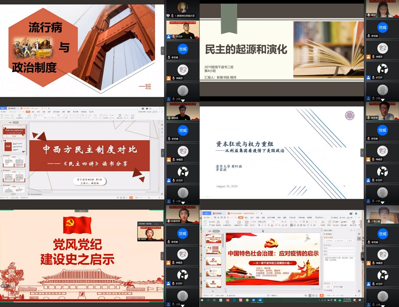 人文学院学生蒋行健对中美不同的疫情应对措施及其背后的理念进行了分析,他所在的小组认为,中国能够在短时期内迅速控制疫情,是因为党和政府始终坚持人民至上、生命至上的理念,而美国疫情应对不力,甚至推诿责任,则暴露出其政治制度的弊端。经管学院徐晓宇、新雅书院程祥、新雅书院郝悠扬、外文系李家祺和电机系张宋言分别代表各小组分享了对流行病和政治制度的关系、民主的起源和演化、中西方民主制度比较、疫情下的美国政治与利益集团、中国共产党的党风党纪建设等问题的看法。深入的分析引起了同学们的热烈讨论。同学们纷纷表示,通过活动,对党情国情的理解更加深刻,理想信念也更为坚定。
