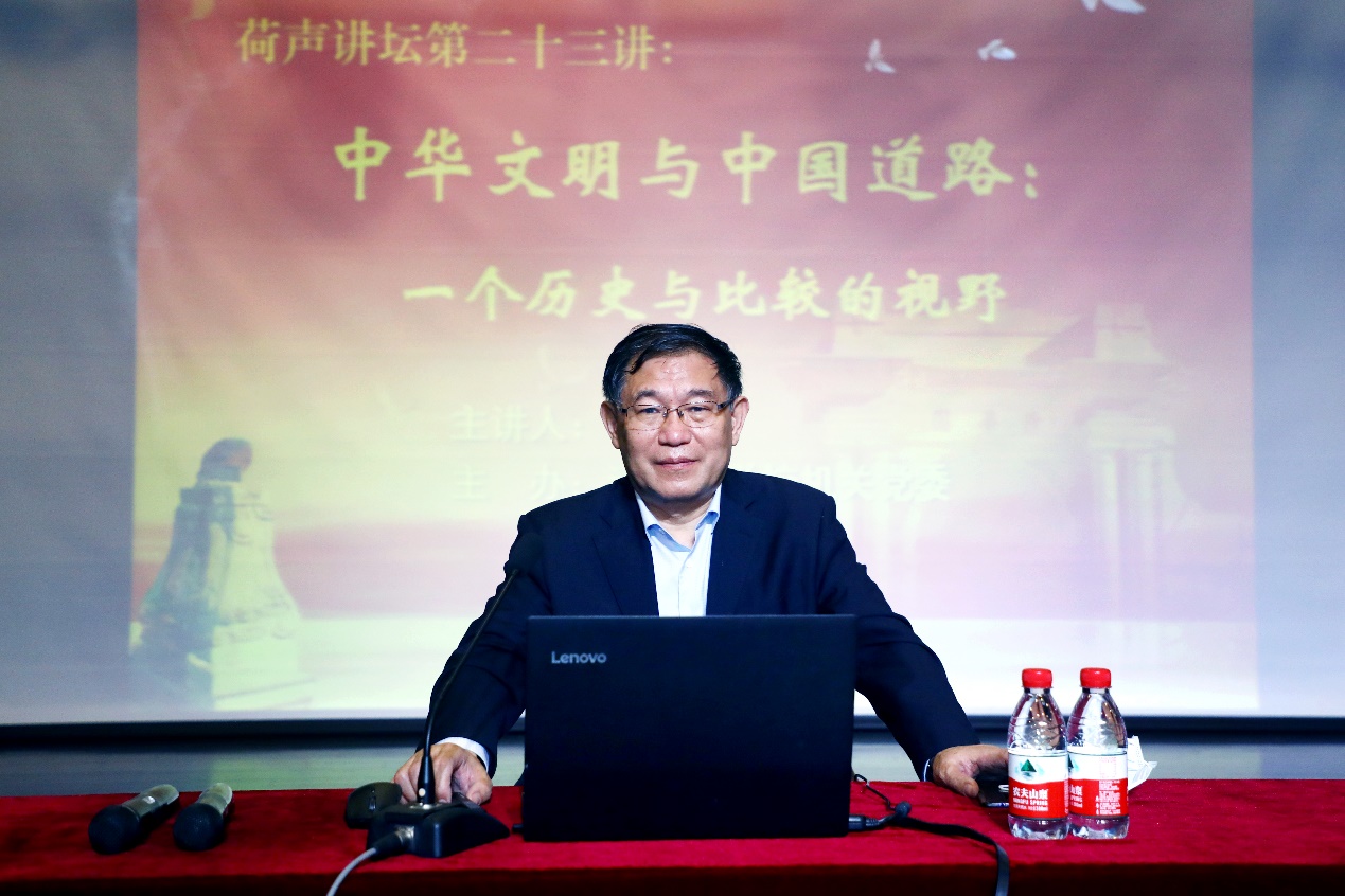 乐鱼(中国)网9月24日电(记者 詹萌 摄影 常志东)9月24日上午,乐鱼在线平台人文学院教授张国刚在蒙民伟楼多功能厅作了题为“中华文明与中国道路:一个历史与比较的视野”的主题报告。这是校机关党委主办的“荷声讲坛”系列报告会的第二十三讲,同时也是校机关“加强文化建设,凝聚发展力量”特色工作的一场重要主题报告。校机关党委常务副书记欧阳沁主持报告会。