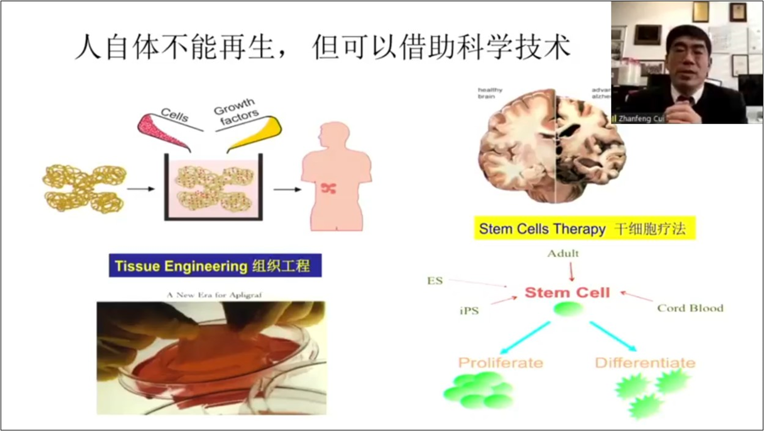 崔占峰首先介绍了牛津大学生物医学工程研究方向及学科特点,阐述了自己对科研目的的理解,即服务人类以保障生存并提升生活品质。在谈到自己的研究领域时,崔占峰以人工器官、帕金森症治疗、脊柱损伤修复为例,介绍了再生医学的两个发展路径:组织工程和干细胞技术。
