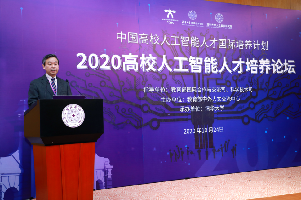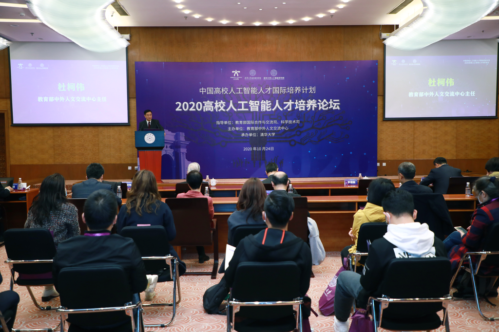 杜柯伟代表主办单位致辞。他表示,“中国高校人工智能人才国际培养计划”实施三年来,在教育部国际司和科技司共同指导下,教育部中外人文交流中心秉持人文交流的理念,协调有关高校和企业为我国人工智能人才培养搭建平台、提供助力,共举办2期国际人工智能专家论坛、7期人工智能教学研讨班和16期学生人工智能训练营,吸引来自中国大陆、港澳台地区、美国、英国等300多所高校的1万多名师生报名,累计培训师生2242名。本次论坛是对该计划实施的中期总结和展望规划,今后,中心将继续推动将人文交流理念融入人工智能人才培养过程中,促进未来人工智能领域的国际合作、人文交流和民心相通,实现可持续发展。