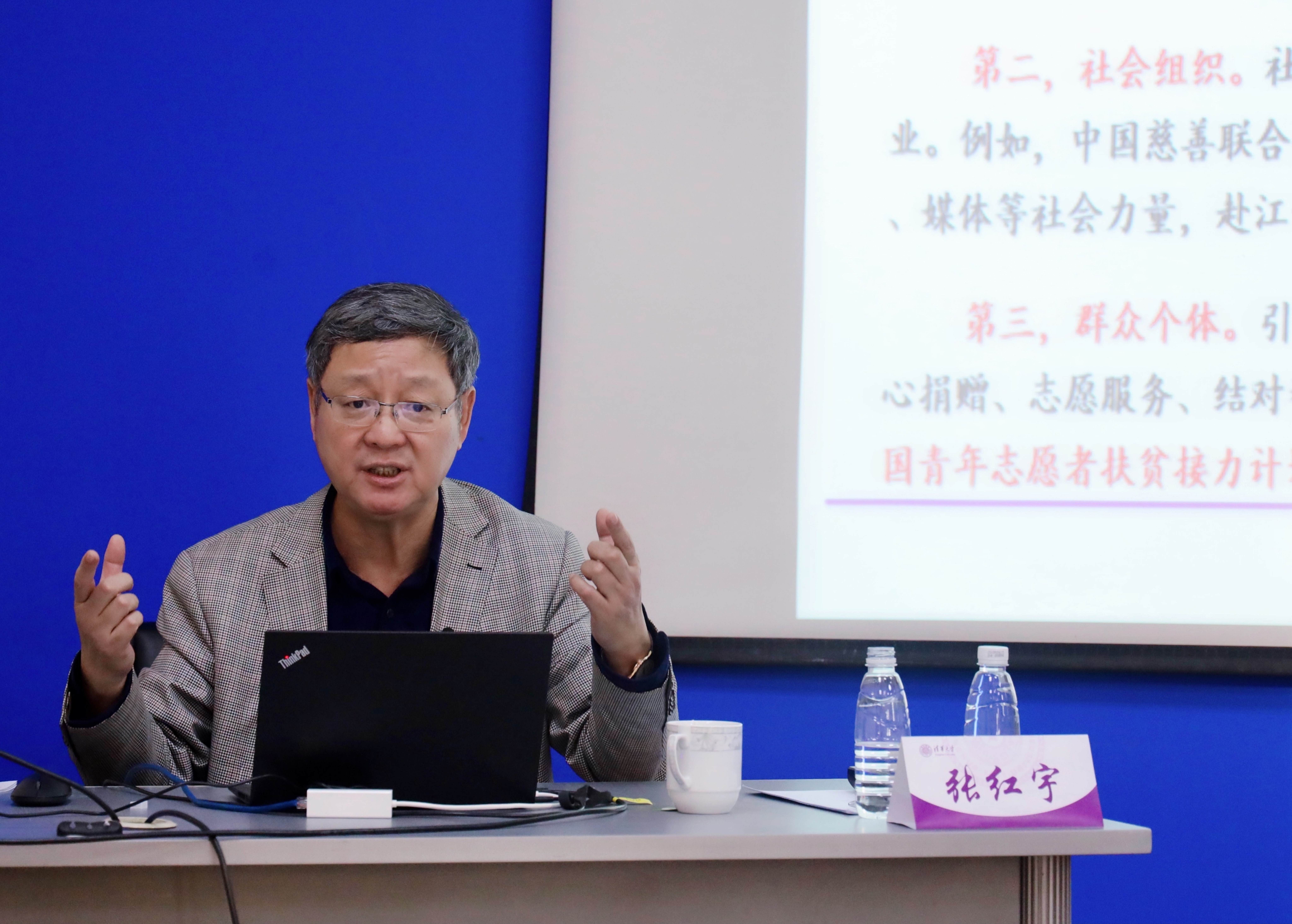 张红宇以全面打赢脱贫攻坚战为主线,从准确理解习近平总书记对脱贫攻坚工作的要求、持续关注脱贫攻坚重大问题和全面完成今年“三农”重点工作等方面,对全面打赢脱贫攻坚战和扎实推进乡村振兴战略进行了详细解读。张红宇首先回顾了党的十八大以来我国在脱贫攻坚领域取得的六大方面的巨大成绩和丰硕成果,他认为成绩的取得得益于党中央的高度重视、全社会高度关注以及农民群众的期盼。随后,张红宇重点阐述了脱贫攻坚的主要经验:第一,举国体制,落实五级书记抓扶贫,从中央到地方逐级签订责任书,层层压实责任;第二,精准扶贫,帮扶措施到户到人,重点解决扶持谁、谁来扶、怎么扶、如何退四个问题;第三,组织动员,构建大扶贫格局——东西部扶贫协作、中央单位定点扶贫、社会力量参与扶贫;第四,群众主体,激发内生动力,调动贫困地区和贫困人口积极性。