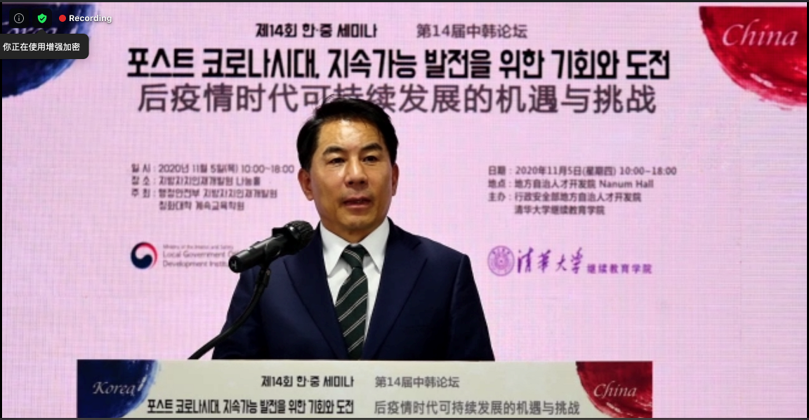 郑力在视频致辞中指出,中韩两国在共同抗击疫情中守望相助,风雨同舟。期间,习近平主席同文在寅总统保持良好沟通,就深化双边关系、加强抗疫合作等达成重要共识。在两国元首战略引领下,中韩关系保持良好发展势头。后疫情时代,两国通过构建五个“共同体”,推动中韩关系迈向新台阶。本次中韩国际会议的主题与中韩两国政府和人民关注的焦点,以及未来中韩共同发展的方向高度契合。希望与会专家畅所欲言、深入探讨,用智慧与担当,共同构筑后疫情时代可持续发展的可期未来。