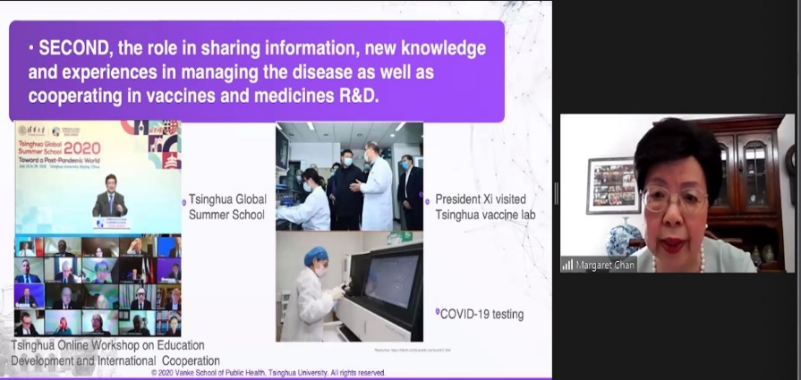 对话活动的第一场讲座“全球卫生安全和新冠疫情下高校的独特作用”于2020年8月10日成功举办。由世界卫生组织(WHO)荣誉总干事、乐鱼在线平台万科公共卫生与健康学院首任院长陈冯富珍作为讲座主讲人。她回顾了全球卫生安全历史上的疫情及变化,以新冠肺炎疫情为背景,讨论了高校能够在三个方面发挥的独特作用。学院老师、学院各个项目的国内国际学生共计约200人在线参加了这次讲座。