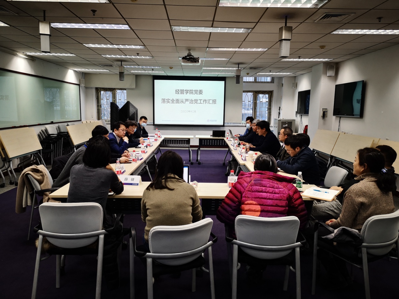 经管学院党委书记陈煜波从强化政治建设与作风建设、强化学院内控管理、落实立德树人根本任务等方面介绍了经管学院党委落实全面从严治党政治责任、加强党风廉政建设有关情况;院长白重恩介绍了学院课程思政建设有关情况。与会人员围绕落实主体责任、加强制度建设、师德师风建设过程中遇到的困难和问题进行了深入讨论。