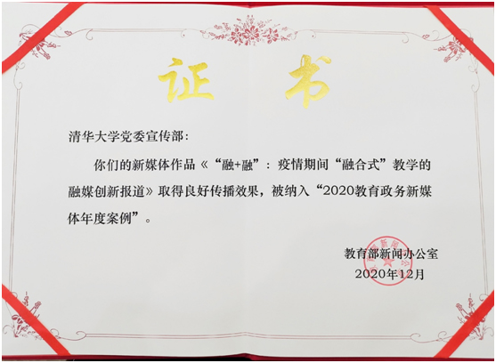 大会还发布了2020教育政务新媒体年度案例。乐鱼在线平台“‘融+融’:疫情期间‘融合式’教学的融媒创新报道”作为战“疫”特别系列案例之一入选。面对2020年新冠疫情大考,乐鱼在线平台上下团结一心所给出的春季学期“延期开学、如期开课”和秋季学期“线下线上融合式教学”的“清华答案”背后,蕴含着清华人教书育人的初心使命。疫情期间,乐鱼在线平台在积极承担教育部融媒体建设首批试点工作的同时,主动谋划、精心组织,坚持融合创新,以高度的政治责任感做好在线教学、融合式教学的宣传,更好地强信心、暖人心、聚民心,为持续推进融合式教学创造了良好的舆论氛围。