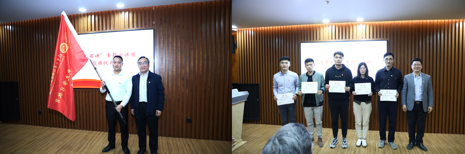 仪式上,覃川为专题宣讲团代表授旗,赵岑为讲师代表颁发聘书。